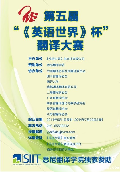 本届大赛为英汉翻译,参赛启事以及原文发布于商务印书馆网站(http://www.cp.com.cn/ )、《英语世界》2014年第5期、《英语世界》官方博客(http://blog.sina.com.cn/theworldofenglish )以及《英语世界》微信公众平台上。