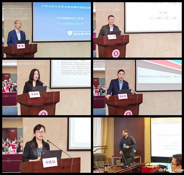 开幕式之后,大会进入主旨发言阶段。教育部大学外语教学指导委员会秘书长、南京大学王海啸教授作了题为《面向学习者的大学英语课程设置》的主旨演讲。王教授的演讲结合即将颁布的《大学英语教学指南》,从宏观的课程设置角度,高屋建瓴,令研讨会听众如沐春风。他精准分析大学英语教学改革动态,简明对比静态与动态的课程设置,重点阐释面向学习者的课程设置。他认为大学英语教学改革的动态趋势是教学目标、课程体系、教学模式、评估手段多样化,教学资源、教学手段、教学反馈数字化,教学内容、培养体系、教师发展专业化。大学英语教学应突出强调“分类指导,个性化教学”,提倡面向学习者的课程设置,实现教学大纲校本化、教学内容多样化、教学过程信息化、教学评估科学化和教师发展专业化。西交利物浦大学的邹斌博士作了题为《中英合作大学学术英语教学课程设置探讨》的主旨演讲。邹博士从EAP的定义入手,娓娓道来,与听众分享了西交利物浦大学学术英语课程设置的具体作法,该校对信息技术、语料库的广泛应用令人耳目一新,对其他高校也很有启发、借鉴意义。上海交通大学外国语学院副院长常辉教授的主旨演讲题为《大学英语教学:共性与个性》。常教授的演讲风格真诚、坦率、犀利,直指大学英语教学的三大根本问题,即大学英语需不需要教?教什么?怎么教?为听众带来一场酣畅淋漓的学术头脑风暴。结合上海交通大学外国语学院的教学与改革实践,他认为教学改革一定要根据各个学校的实际情况校本化,在教改中体现共性与个性,切不可盲从,必须尊重科学规律。