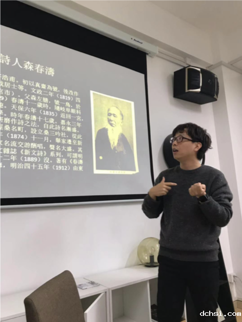 1219日下午1300, 外语学院青年学术联谊会在223阅览室举办了陈文佳老师作《森春涛的香奁诗受容与汉诗创作》读书交流会。本次读书会打破学术联谊会一贯选读译作的传统,首次邀请陈文佳老师来分享他这部专业性十分强的学术著作。日语系陈凌虹老师、杨敬老师、英语系陈贝贝老师、《外语教学理论与实践》编辑舒畅老师作为嘉宾出席,日语系十余位学生参加了本次读书会。