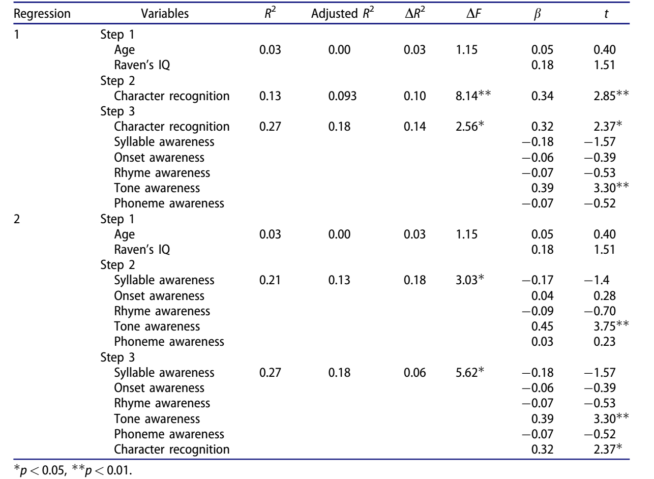 分层回归分析的结果进一步证明了语音意识和语音编码能力对于高阶读写能力的语言内和语言间的长期预测作用。具体而言,有以下两个重要研究发现: