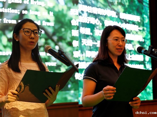 来自大学英语部教工党支部汪燕和行政党支部王丹丹合作朗诵了《青春》,呼吁在场党员以梦为马,不负韶华。