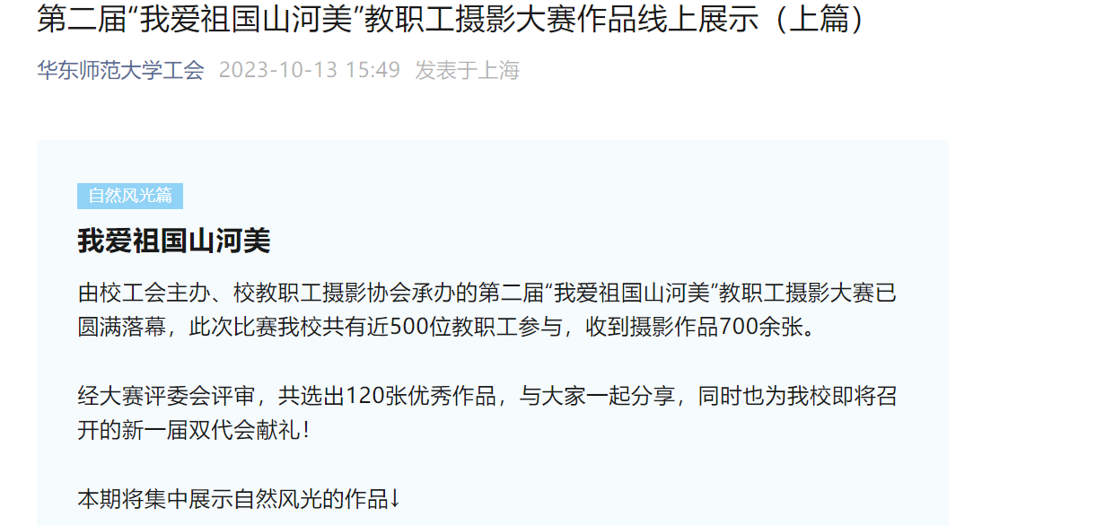 赵朝永、苏俊玲、胡婧、石兰、曹艳艳、王丹丹、韦玮、夏萍获评第二届“我爱祖国山河美”教职工摄影大赛优秀作品奖。