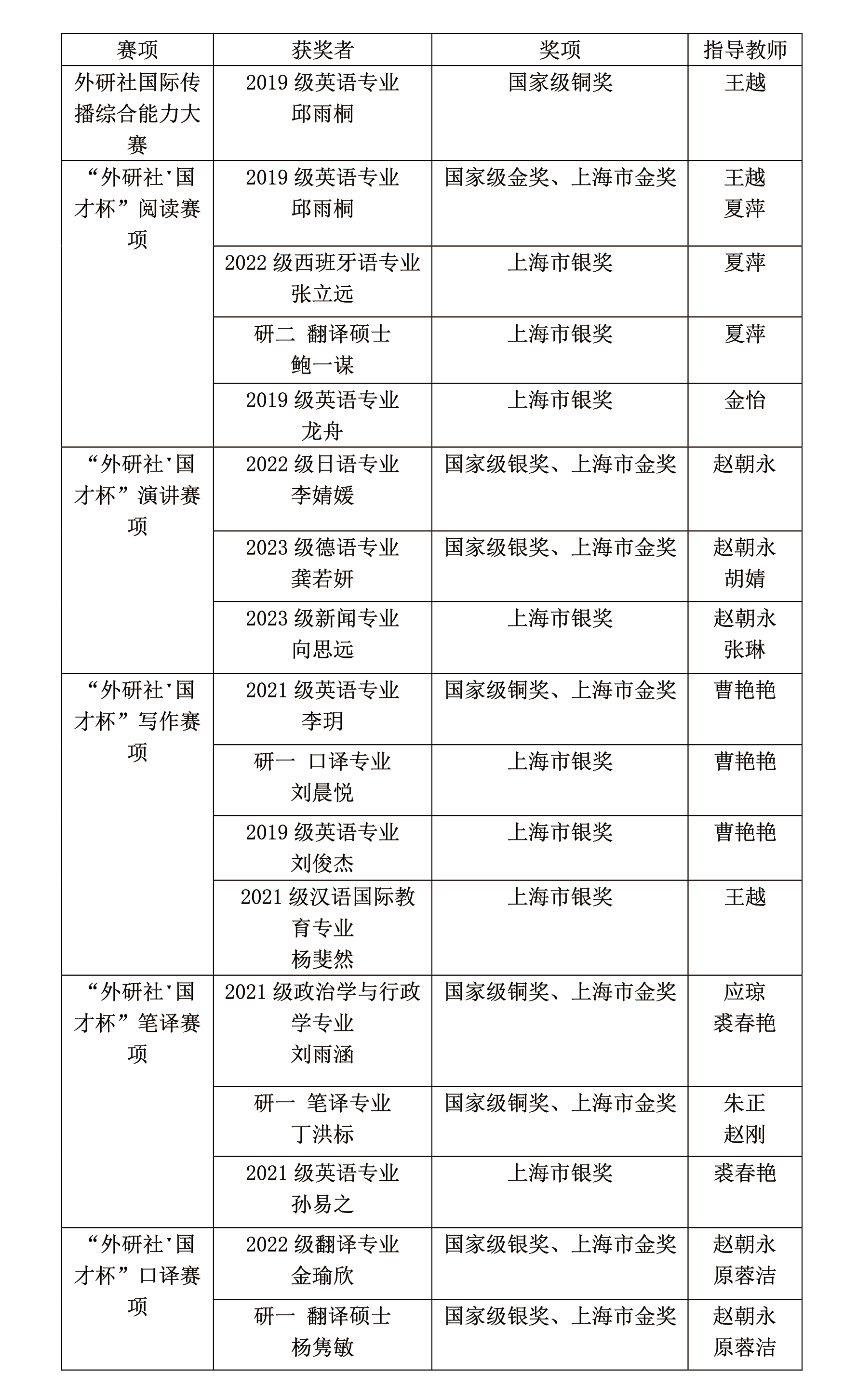 大学英语教学部教师指导学生获得国际传播综合能力大赛和“外研社ˑ国才杯”“理解当代中国”全国大学生外语能力大赛阅读、演讲、写作、笔译、口译国赛、市赛多个奖项。