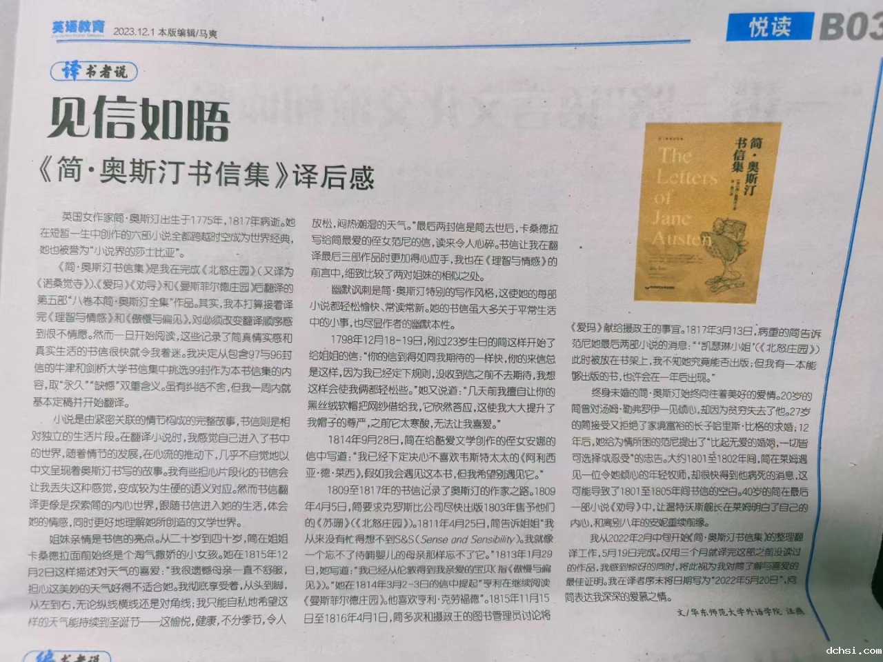 汪燕在中国日报《21世纪英语教育》“译书者说”栏目发表“见信如晤:《简•奥斯汀书信集》译后感”。