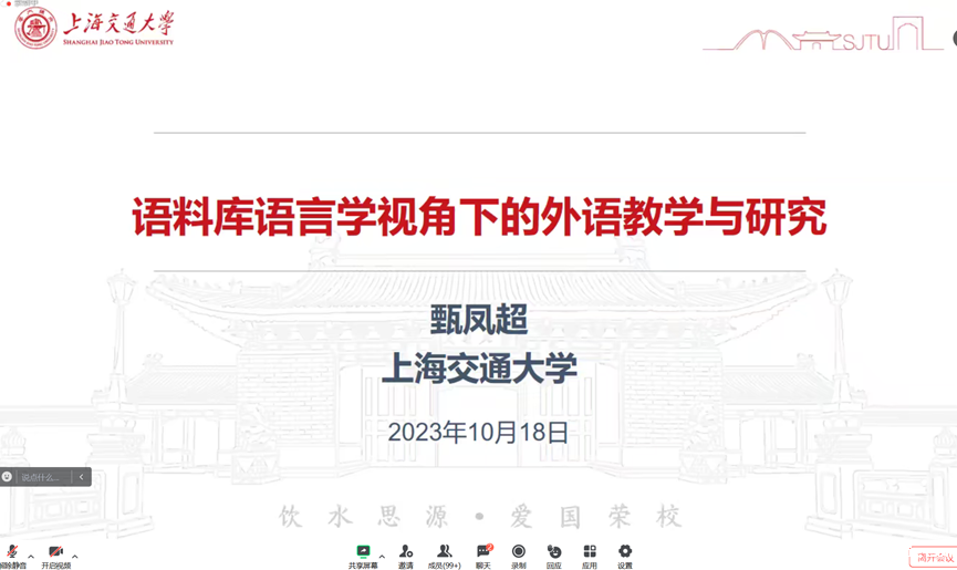 大学英语教学部举办校庆线上学术讲座。上海交通大学甄凤超教授做“语料库语言学视角下的外语教学与研究”专题讲座。