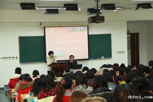 宋进教授从十八大报告的结构、内容等方面,详细阐述了其精神实质和内涵,全面系统地阐释了十八大报告的重大思想观点和重大战略部署。宣讲紧扣十八大报告的主题,既突出重点又结合实际,既有理论深度,又有现实针对性,宣讲结合我国改革开放和现代化建设、国际国内形势和干部群众的思想实际,对党的十八大报告的思想、观点、论断和新提法、新亮点、新举措、新部署进行了详细解读。最后,宋进教授希望在座的老师们和同学们认真学习领会十八大精神实质,努力践行社会主义核心价值观,坚定信心,坚持科学发展观,为国家和社会的发展作出自己应有的贡献。