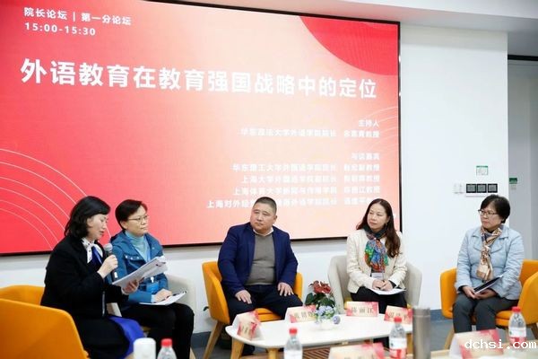 第一分论坛由华东政法大学外语学院院长余素青教授担任主持,华东理工大学外国语学院院长赵宏副教授、上海大学外国语学院副院长戴朝晖教授、上海体育大学新闻与传播学院陈丽江教授及上海对外经贸大学国际商务外语学院院长温建平教授四位嘉宾参与交流。专家们以 “外语教育在教育强国战略中的定位”的主题展开讨论,提出外语学科要以创新应挑战、以自信对质疑、以成绩争地位。