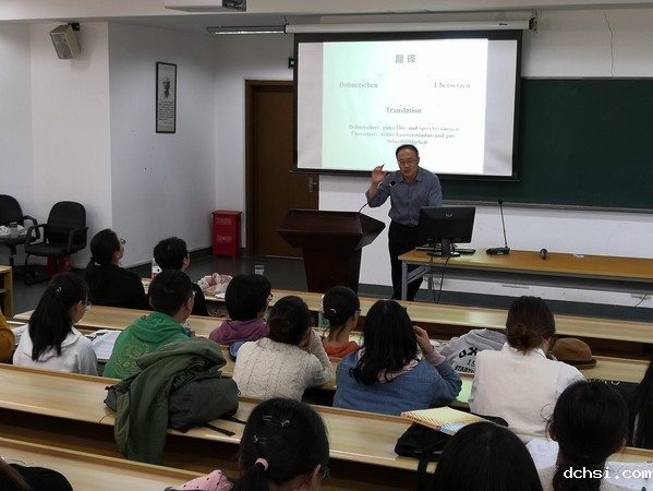 作为我国德语界翻译领域的著名专家,宋健飞教授以“译事非易事”为题,从口、笔译两个方面,理论联系实际,通过具体的实例,运用风趣幽默的语言,以深入浅出的解说,让大家分享了他的经验,使同学们了解到一名优秀的译者所应具备的素质,可能面临的困难以及解决问题的办法。