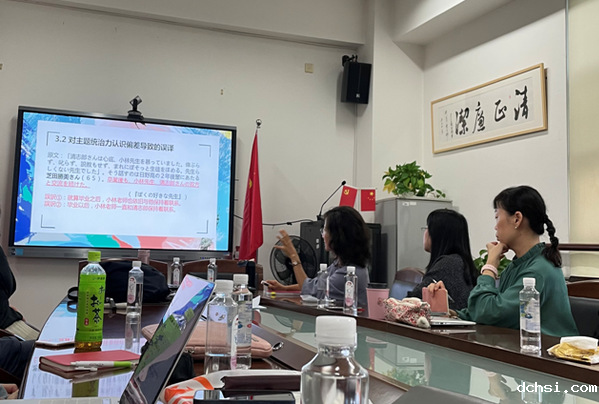 报告中,乔老师以日语系三年级学生在日译汉课上使用的6篇《天声人语》(选自《朝日新闻》)为素材,收集了38名学生的的180篇汉语译文,从“视点+着眼点”“主题的势力”等维度对译文中因主题省略导致的翻译偏误进行了详致的分析和考察,探明了学习者产生误译的主要原因,提出了两个教学对策。一个是,对于“主题统治力认识偏差”问题,提出可以导入“C位定律”的对策;另一个是,对于“主题视点”问题,提出可以运用“第一人称代入法”加以验证的对策。乔颖老师的报告,结合学生的翻译实例,深入浅出,内容详实。老师们就日语与中文文章的写作特点、中日标点符号的差异、《雪国》英译本及中译本的准确性问题、口译课堂的主语省略问题的教学实践等进行了广泛而深入的交流。