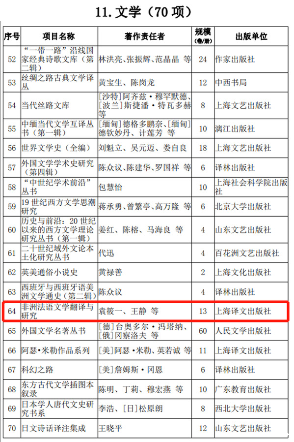 2021年12月30日,国家新闻出版署发布《出版业“十四五”时期发展规划》,外语学院法语系袁筱一、王静等专家编著的《非洲法语文学翻译与研究》成功入选“十四五”时期国家重点图书出版专项规划。
