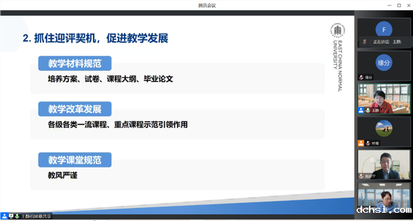 吴平颐传达了学校教务处相关会议精神,介绍了新一轮审核评估的特点与方法。他指出,本轮审核评估坚持问题导向,通过深度分析为高校精准“画像”。希望外语学院通过自评自建,不断提升人才培养质量,构建完善的质量保障体系,推动学院教育教学综合改革取得实效。希望各位老师持续重视教学质量和课堂建设,将评估评建寓于日常工作中。