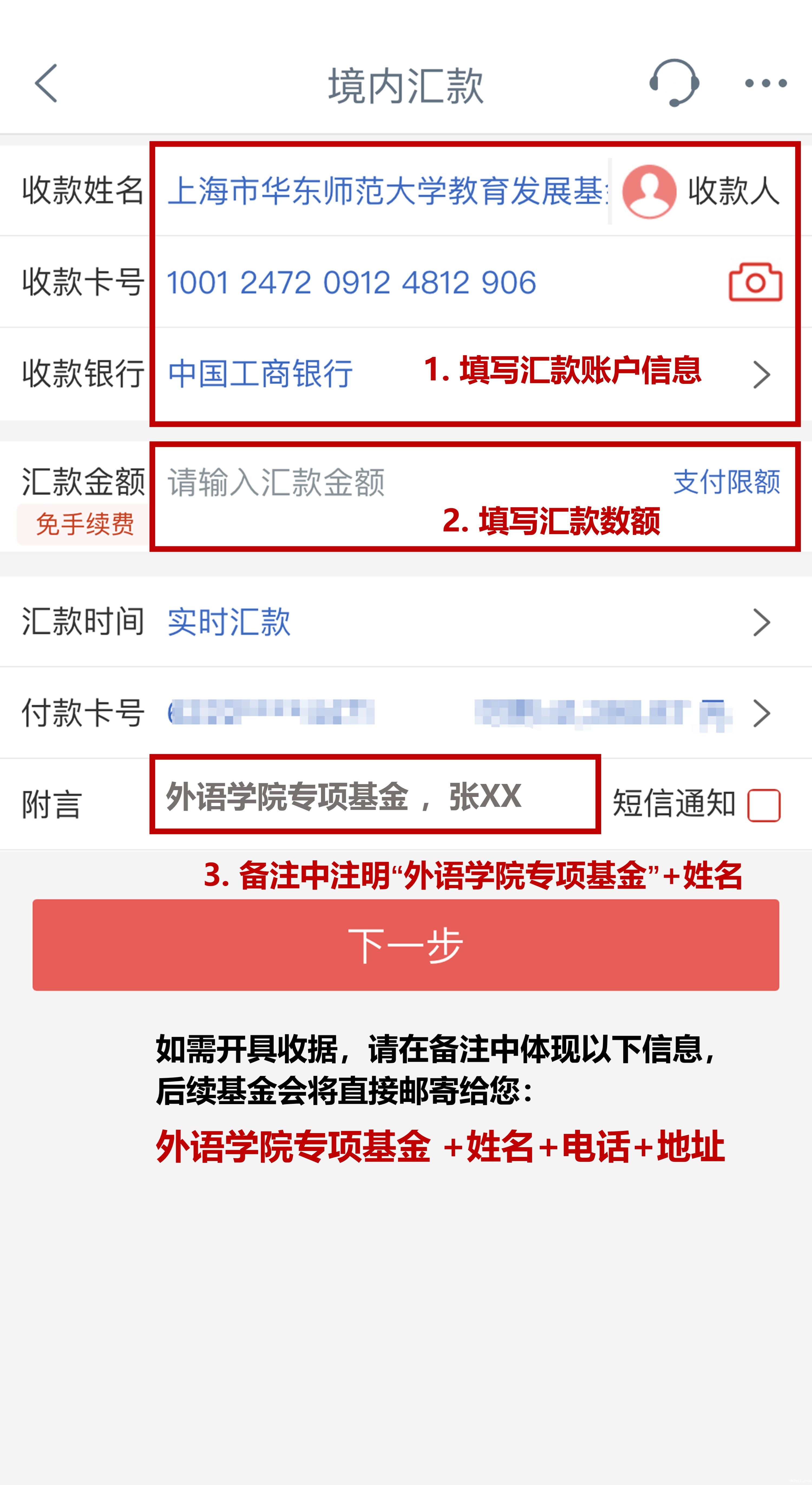 第三步:学校基金会可以给每笔捐赠开具捐赠收据,收据可用于个税抵扣,有需要开具收据的校友请务必在摘要中留下姓名、电话和地址,基金会后续将按照此信息邮寄给您。